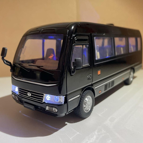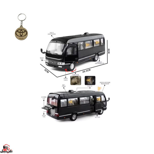ماکت ماشین ناب سل مدل مینی بوس تویوتا کاستر فلزی سانروف چراغدار موزیکال عقب کش Toyota Coaster Bus به همراه جاسوییچی با ابعاد تقریبی: 8*7*21 سانت و دو درب راننده و مسافر بازشو و درب موتور در قسمت عقب بازشو و دارای سانروف کشویی بازشو وتمام پنجره ها شیشه دارد و کشویی بازشو و همچنین چرخش چرخهای جلو به طرفین و با قابلیت قفل شدن چرخ به طرفین دلخواه و این ماشین موزیکال (صدای استارت و حرکت )چراغدار ( چراغ های جلو و عقب و داخل اتاق روشن میشود ) و عقب کش وآینه های بغل و پشت مینی بوس قابلیت انعطاف دارد و این ماشین کمک فنر دارد و از جنس فلزی سنگین و خاص ، دارای رنگبندی سفید و مشکی میباشد و دارای کیفیت عالی با آرم و نوشته های زیبای تویوتا کاستر مناسب برای کلکسیونرها و مجموعه داران ،این محصول توسط برند معتبر XHO تولید شده و تحت لیسانس تویوتا میباشد. کیفیت ساخت بالا، جزئیات دقیق و رنگ مشکی و سفید جذاب باعث شده تا این ماکت انتخابی فوقالعاده برای هدیه یا تکمیل کلکسیون شما باشد.از نظر امکانات، این ماکت دارای مکانیزم عقبکش بوده و حرکت نرم و روانی دارد. همچنین به صورت موزیکال چراغدار طراحی شده و سه حالت مختلف برای استفاده دارد:حالت موزیکال همراه با روشن شدن چراغها :حالت چراغ دائم روشن ،حالت خاموش و میتواند به عنوان هدیه ای مناسب برای کودکان شما باشد .